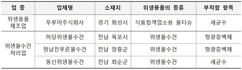 또한 유통 중인 위생용품 717건을 수거해 기준·규격 적합 여부를 검사한 결과, 위생물수건 3건과 식품접객업소용 물티슈 1건에서 세균수 등이 초과 검출되어 해당 제품을 회수해 폐기 조치했다.